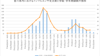 年末で一旦流行が治まっていたインフルエンザですが、1月後半からSNSやニュースでもインフルエンザの再流行(B型)というワードが聞こえています。実際のところ流行状況がどうなのか、香川県内の定点数と学級・学年閉鎖数の推移をグラフ化したものをご紹...