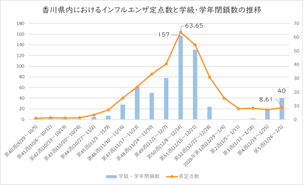 実際のところ流行状況がどうなのか、香川県内の定点数と学級・学年閉鎖数の推移をグラフ化したものをご紹介します。