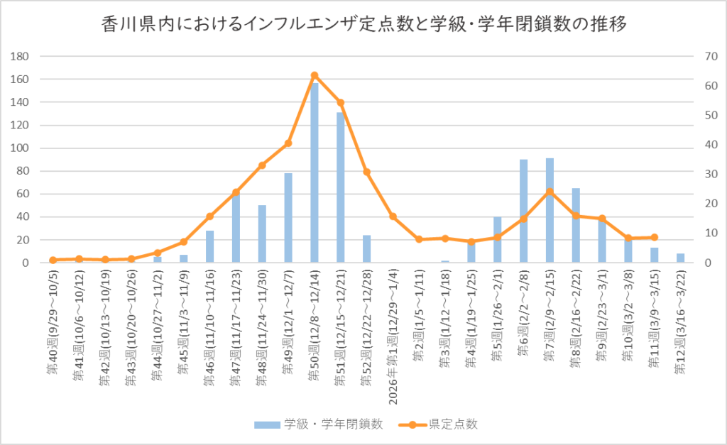 2026年3月22日時点で発表された香川県内におけるインフルエンザ流行状況をまとめました。